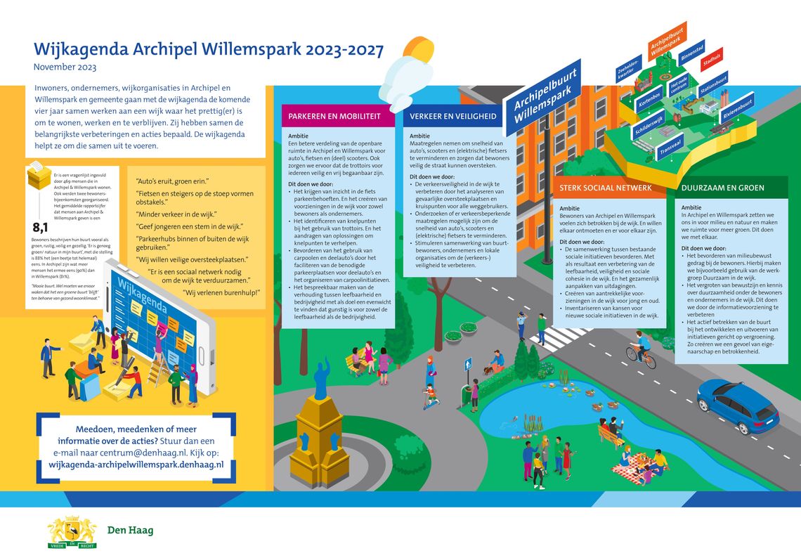 Archipel Willemspark heeft nu een eigen wijkagenda. Hierin staan de 4 belangrijkste thema’s voor de wijk tussen 2023 en 2027. Bewoners, de bewonersorganisatie, ondernemers en wijkpartners hielpen mee bij het maken van de wijkagenda. Ook zullen zij samen met de gemeente aan de uitvoering van de wijkagenda gaan werken.