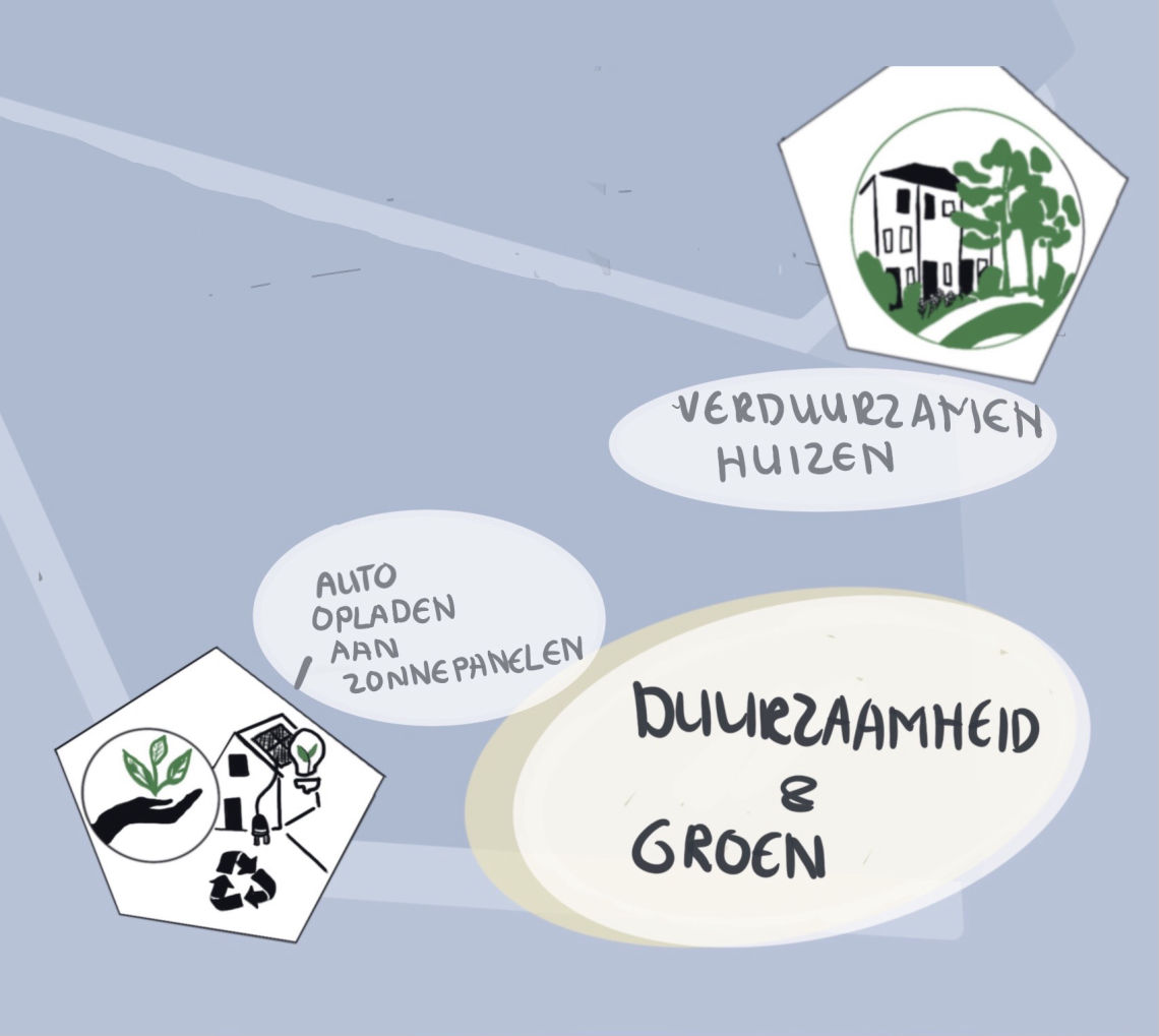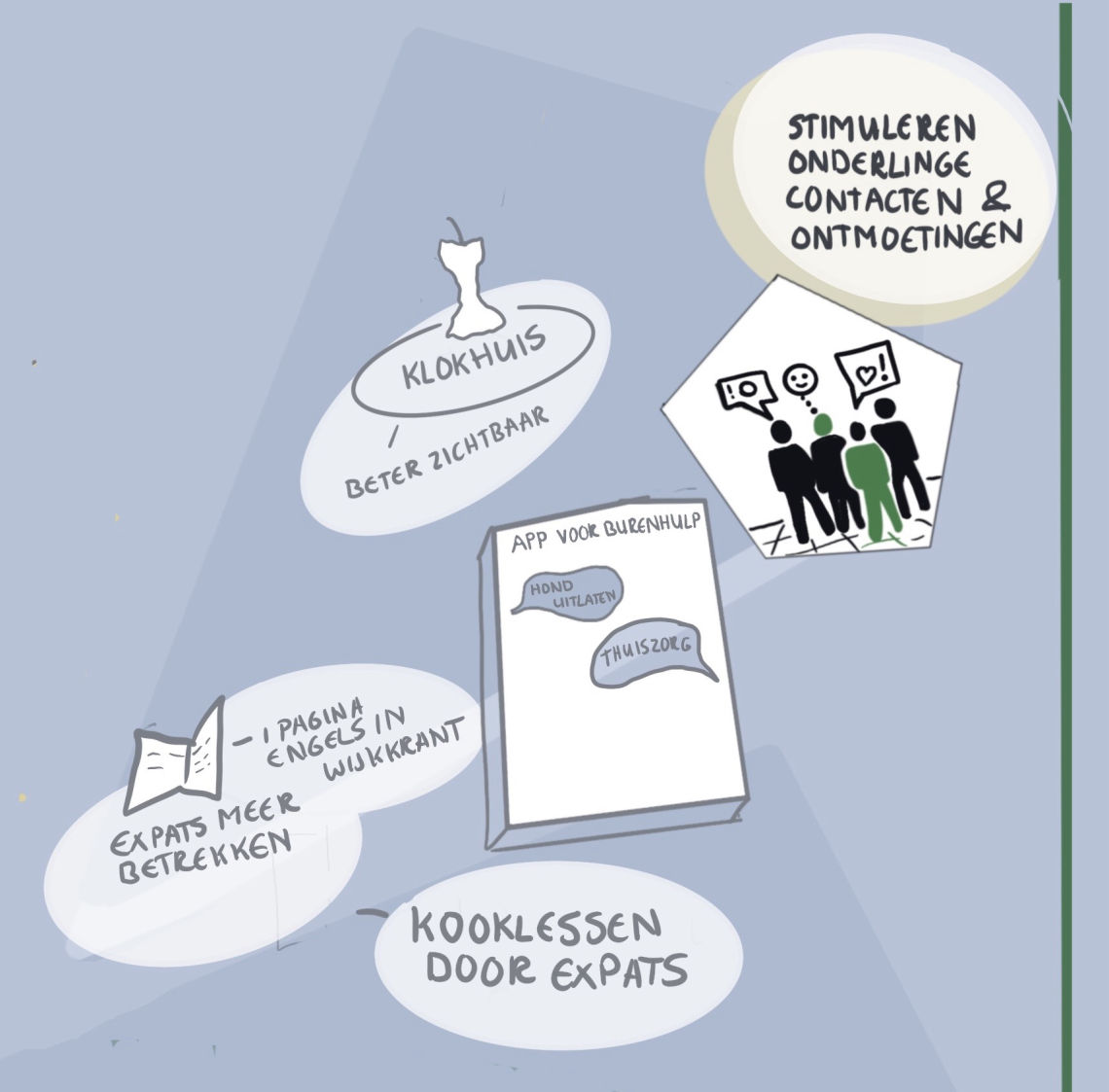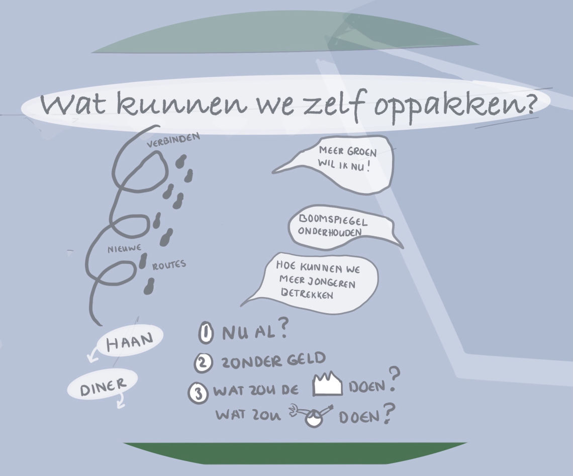 Onder enthousiaste begeleiding van Joël Willems van het bureau Huis van Verbeelding is creatief geoefend met hoe je vanuit bewonersinitiatieven de doelen voor het uitvoeren van de vier thema agendapunten kunt omzetten in concrete acties. Dat was niet altijd makkelijk, maar er kwamen mooie ideeën uit. Sommige realistisch, sommige origineel maar wellicht minder makkelijk uitvoerbaar. Een aantal voorbeelden: